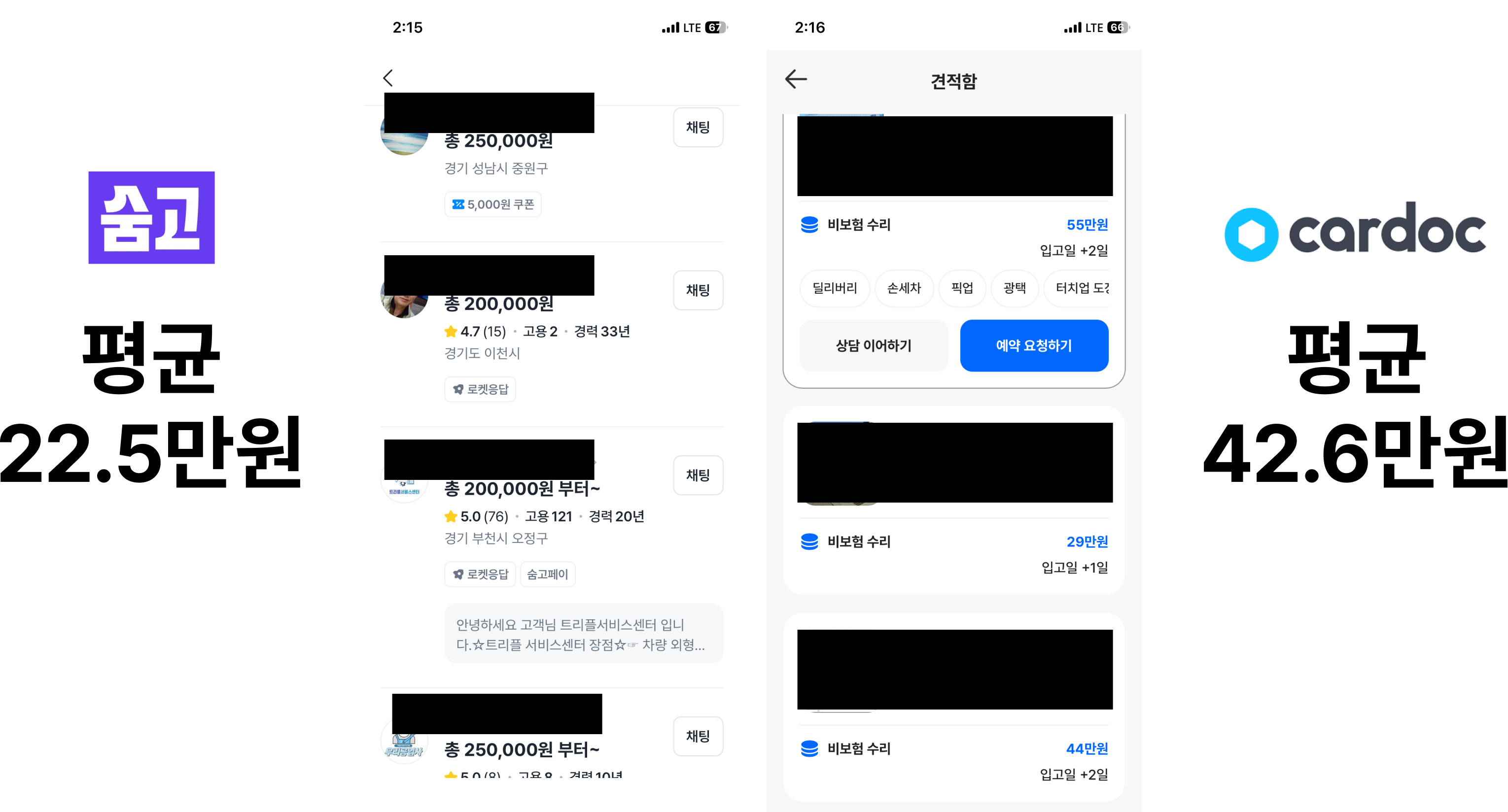 찝찝한 기분으로 다른 어플을 깔았다. '숨고'이다. 예전에 집 건축할 때 아주 잘 사용했던 어플이라 내 기억에서 인상이 좋았다. 숨고에도 차량 수리가 있겠지 하고 확인해봤다. 그리고 견적을 요청했더니,