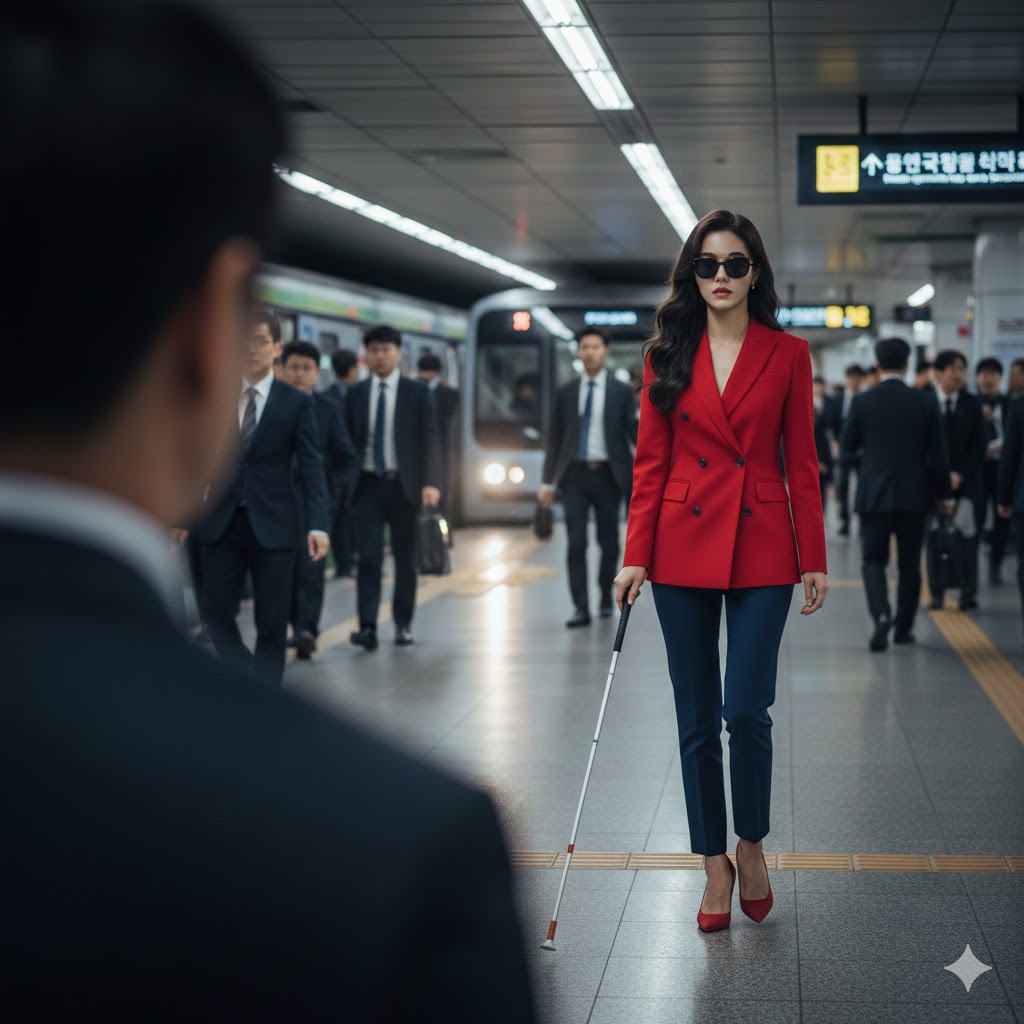 틱. 틱. 소리는 그녀가 가진 지팡이가 땅에 부딪치면서 나는 소리였다. 그녀는 시각 장애인이었다. 그리고 지팡이 소리와 리듬을 맞춰 그녀의 새빨간 하이힐이 바닥을 때리면서 경쾌한 탁!소리가 났다. 틱. 탁! 틱. 탁! 소리는 점점 나와 가까워졌고 나의 심장도 그 리듬에 맞춰 두근두근했다.
